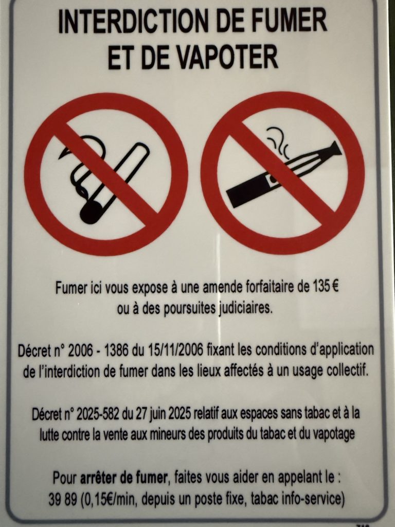 Un point central du décret de 2025 concerne l’obligation d’affichage. Toute entreprise ou lieu où s’applique l’interdiction doit afficher de manière visible et lisible la signalisation rappelant l’interdiction de vapoter et de fumer.